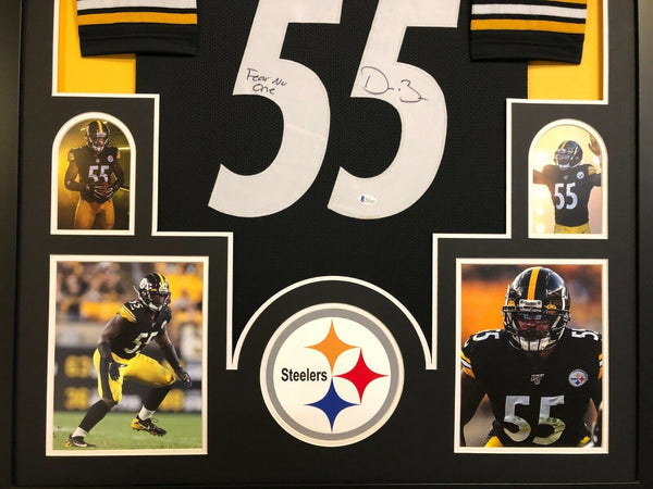 Custom Framed Devin Bush hand signed inscribed "Fear No One" Pittsburgh Steelers custom jersey.BECKETT Hologram and COA(#WB31635)The authentication is from BAS. This signature is authenticated by a representative of BAS! 100% AUTHENTIC!!! The jersey has fully stitched numbers on the front and back. It is a great item and a must for all great sports fans!This item is professionally framed, it measures 32"x40" inside , 42"x34" outside , using UV protective Acrylic glass for safe keeping and safe transport, team color matting, black moulding and hanging hooks on the back. All additional items in frame seen in pictures included. 100% ready to hang in your fan cave.