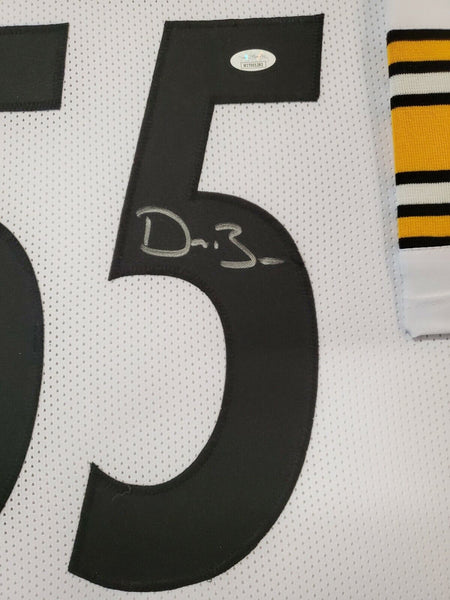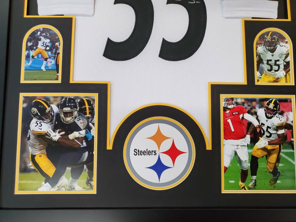 Custom Framed Devin Bush hand signed Pittsburgh Steelers custom jersey.JSA Hologram and COA(#WIT001282)The authentication is from JSA. This signature is authenticated by a representative of JAS! 100% AUTHENTIC!!! The jersey has fully stitched numbers on the front and back. It is a great item and a must for all great sports fans!This item is professionally framed, it measures 32"x40" inside , 42"x34" outside , using UV protective Acrylic glass for safe keeping and safe transport, team color matting, black moulding and hanging hooks on the back. All additional items in frame seen in pictures included. 100% ready to hang in your fan cave.