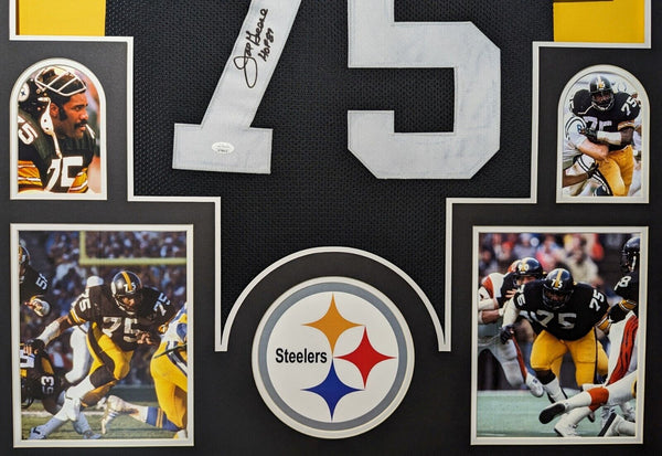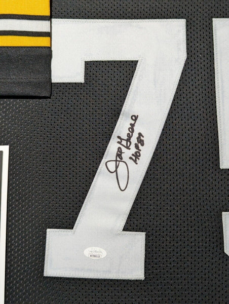 Custom Framed Mean Joe Greene hand signed Pittsburgh Steelers style custom jersey.JSA Hologram and COAThe authentication is from JSA. This signature is WITNESSED by a representative of JSA! 100% AUTHENTIC!!! The jersey has fully stitched numbers on the front and back. It is a great item and a must for all great sports fans!Stock photos are used for auctions. Will receive equal quality.This item is professionally framed, it measures 32"x40" inside , 42"x34" outside , using UV protective Acrylic glass for safe keeping and safe transport, team color matting, black moulding and hanging hooks on the back. All additional items in frame seen in pictures included. 100% ready to hang in your fan cave.