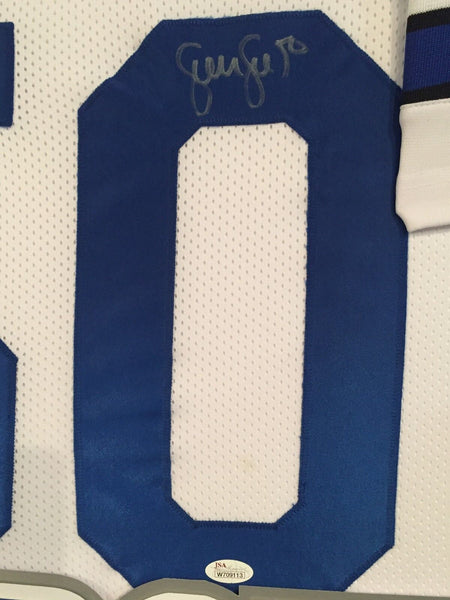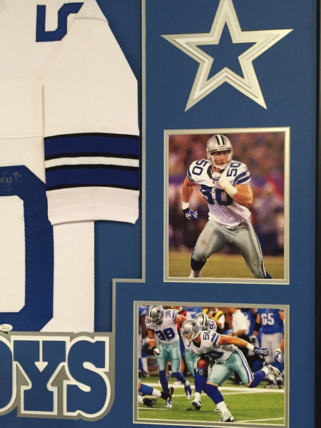 Custom Framed Sean Lee hand signed Dallas Cowboys jersey.JSA Hologram and COA(#W709113)The authentication is from JSA. This signature is not authenticated by opinion but it is WITNESSED by a representative of JSA! 100% AUTHENTIC!!! The jersey has fully stitched numbers on the front and back. It is a great item and a must for all great sports fans!This item is professionally framed, it measures 32"x40" inside , 42"x34" outside , using UV protective Acrylic glass for safe keeping and safe transport, team color matting, black moulding and hanging hooks on the back. All additional items in frame seen in pictures included. 100% ready to hang in your fan cave.