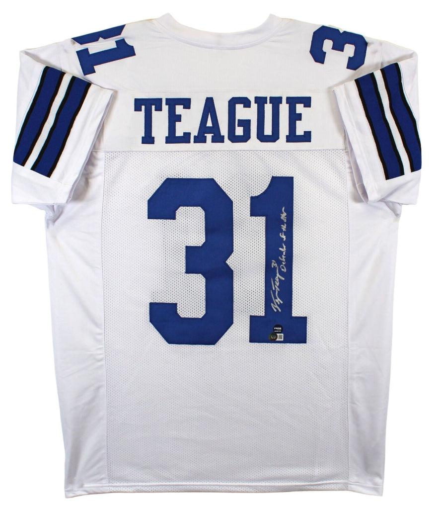 This Autographed White Pro Style Jersey with the inscription of "Defend The Star" has been Personally Signed by George Teague of the Dallas Cowboys. This item is 100% Authentic to include a hologram by Beckett Authentication Services. This item will come with an affixed Beckett Authentication Services (BAS) authentication sticker, which includes a scannable QR code to verify authenticity. Please note that Beckett no longer provides serial-numbered COA cards, and the attached BAS sticker will serve as the complete authentication for this item. This is a BAS Witnessed Protection Program item which means a Beckett Authentication Service representative was present when this item was being signed. We conducted an autograph signing with George Teague where multiples of the same item were signed. While the photographs are representative of this item, the size, placement and strength of the signature may vary. Each item is hand signed, therefore, each autograph is unique. This item can be verified through BAS Witnessed. This is a X-Large sized, non-branded, custom-stitched Jersey.
