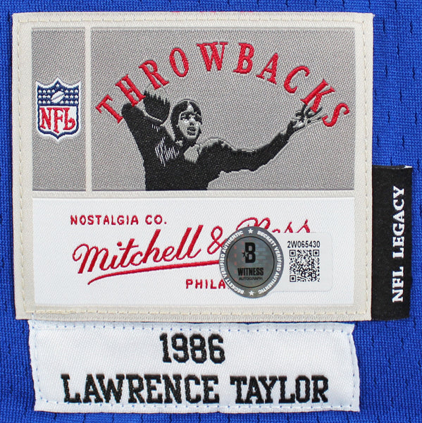 This Autographed Blue Mitchell & Ness Jersey with the inscription of "HOF 99" has been Personally Signed by Lawrence Taylor of the New York Giants. This item is 100% Authentic to include a hologram by Beckett Authentication Services. This item will come with the new Beckett Authentication hologram that has a scannable QR code rather than the traditional COA. If you would like to have a COA, you are welcome to reach out to Beckett for a printed certification once you receive your item. This is a BAS Witnessed Protection Program item which means a Beckett Authentication Service representative was present when this item was being signed. This is a stock item. We conducted an autograph signing with Lawrence Taylor and we have several of these available. The one you will receive will be of equal quality to the one pictured. This item can be verified through BAS Witnessed. This is a X-Large sized Jersey.