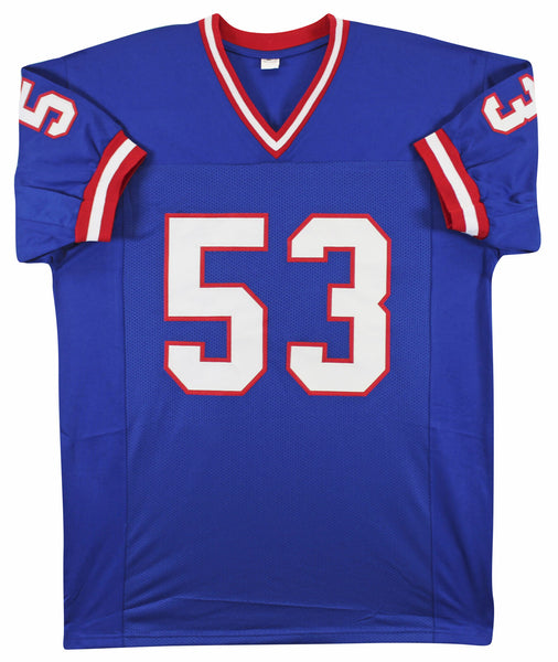 This Autographed Blue Pro Style Jersey has been Personally Signed by Harry Carson of the New York Giants. This item is 100% Authentic to include a hologram by Beckett Authentication Services. This item may come with the new Beckett Authentication hologram that has a scannable QR code rather than the traditional COA. If you would like to have a COA, you are welcome to reach out to Beckett for a printed certification once you receive your item. This is a BAS Witnessed Protection Program item which means a Beckett Authentication Service representative was present when this item was being signed. We conducted an autograph signing with Harry Carson where multiples of the same item were signed. While the photographs are representative of this item, the size, placement and strength of the signature may vary. Each item is hand signed, therefore, each autograph is unique. This item can be verified through BAS Witnessed. This is a X-Large sized, non-branded, custom-stitched Jersey.
