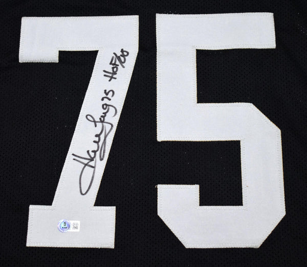Howie Long Autographed Black Pro Style Jersey w/ HOF - Beckett W Hologram *Black THIS IS NOT AN NFL JERSEY. THIS HAS NO TAGS, NO LOGOS, NO EMBLEMS. This is a hand autograph of Howie Long on a custom (Non Name Brand) Authentic style Jersey with stitched letters and numbers. Inscribed HOF. This item has a Beckett Witnessed Authentication, which comes with a Beckett numbered hologram and a QR code for verification. You can view this item on the Beckett Authentication website, it shows when and where the item was signed. It was signed either at a public autograph appearance or a private signing. This is a stock photo of the item. Although you may not receive this exact item, the item you receive is virtually identical and brand new in great shape. Jersey size is XL.
