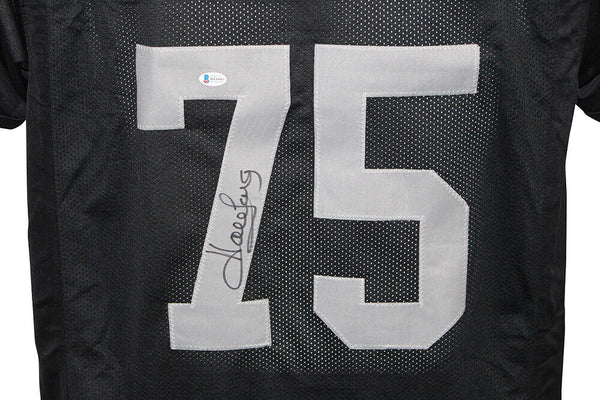 Howie Long Autographed/Signed Pro Style Black XL Jersey BAS 30407 The number in the listing title is just an inventory sku for our records and is not the authentication number. This is a custom pro style black XL jersey with sewn on name and numbers that was personally autographed by Howie Long. Includes a certificate of authenticity from Beckett Authentication Services (BAS) and Denver Autographs.