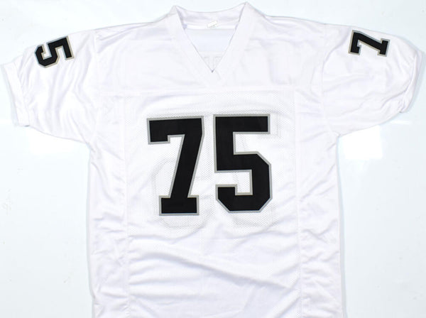 Howie Long Autographed White Pro Style Jersey w/ HOF - Beckett W Hologram *Silver THIS IS NOT AN NFL JERSEY. THIS HAS NO TAGS, NO LOGOS, NO EMBLEMS. This is a hand autograph of Howie Long on a custom (Non Name Brand) Authentic style Jersey with stitched letters and numbers. Inscribed HOF. This item has a Beckett Witnessed Authentication, which comes with a Beckett numbered hologram and a QR code for verification. You can view this item on the Beckett Authentication website, it shows when and where the item was signed. It was signed either at a public autograph appearance or a private signing. This is a stock photo of the item. Although you may not receive this exact item, the item you receive is virtually identical and brand new in great shape. Jersey size is XL.
