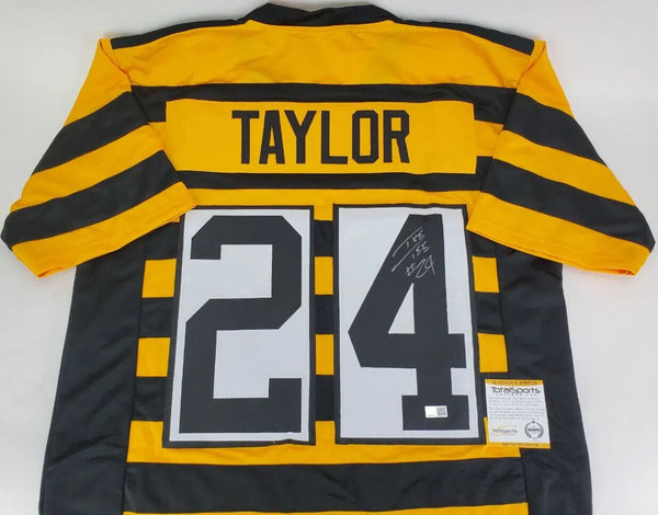 Custom on-field style Pittsburgh Steelers Bumble Bee Throwback jersey. Everything is sewn on, size adult XL. Hand-signed by Ike Taylor.This autograph is certified by Total Sports Enterprises (TSE). It comes with the numbered authentication hologram with a QR code that verifies the authentication on the TSE website.Custom on-field style jerseys are a more affordable option for autograph seekers. These jerseys do not have any brand name or tags and are made in the Philippines. They feature stitched on names and numbers and are made to look very similar to the on-field jerseys that the players wear. These custom jerseys are very commonly used in the memorabilia industry.