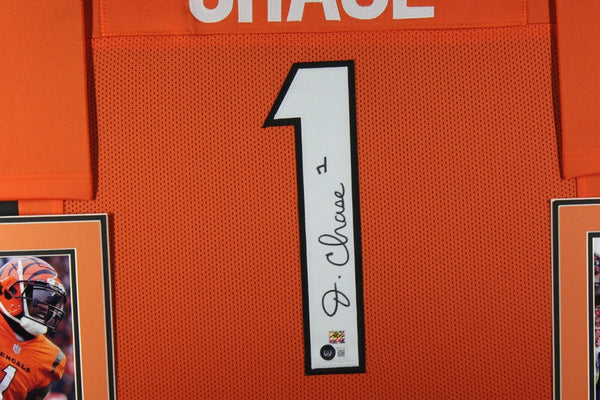 JA'MARR CHASE AUTOGRAPHED & PROFESSIONALLY FRAMED PRO-STYLE JERSEY(Occasionally our own stock pictures are used at times due to quantity of framing, all frames will look identical as the one pictured)THE FRAMED JERSEY MEASURES 35"x 44" & COMES WITH THE FOLLOWING:-UV Protected Acrylic-Triple Acid Free Team Colored Matting-2 High Quality 8"x10" Photos-Team LogoEvery framed autographed jersey is accompanied with a tamper-proof hologram on the signed part of the jersey from one of the main authenticators in the industry (JSA, Beckett, PSA, etc.) and can be verified on their corresponding websites to prove authenticity.