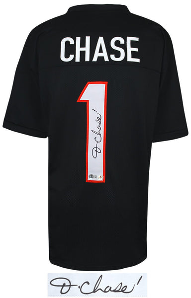 Ja'Marr Chase signed black custom football jersey. Item comes with a Beckett Authentication tamper evident numbered sticker and matching Certificate of Authenticity which can be verified online. Jersey is size XL.