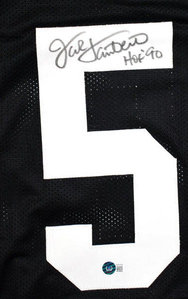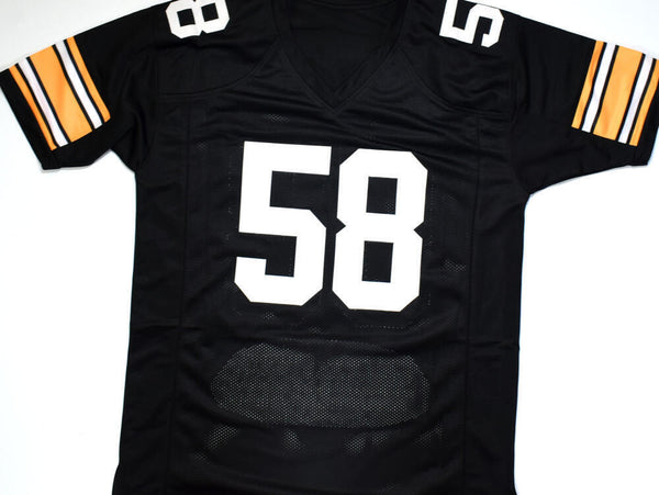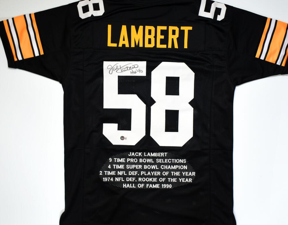 Jack Lambert Autographed Black Pro Style STAT Jersey w/ HOF -Beckett W Hologram *Black THIS IS NOT AN NFL JERSEY. THIS HAS NO TAGS, NO LOGOS, NO EMBLEMS. This is a Hand Autograph of Jack Lambert on a custom made (Non Name Brand) authentic style STAT jersey with stitched letters and numbers. Inscribed HOF. This item has a Beckett Witnessed Authentication, which comes with a Beckett #'ed Sticker hologram and a QR code for verification. You can view this item on the Beckett website and it shows when and where the item was signed. It was signed either at a public autograph appearance or a private signing. This is a stock photo of the item. Although you may not receive this exact item, the item you receive is virtually identical and brand new in great shape. Jersey size is XL.