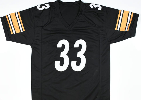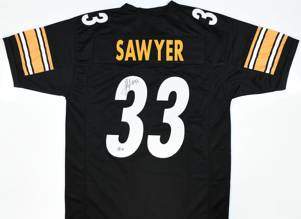 THIS IS NOT AN NFL JERSEY. THIS HAS NO TAGS, NO LOGOS, NO EMBLEMS. This is a hand autograph of Jack Sawyer of the Pittsburgh Steelers on a Custom made (non-name brand) Authentic Style Jersey with stitched letters and numbers. This item has a Beckett Witnessed Authentication, which comes with a Beckett numbered sticker hologram and a QR Code for verification. You can view this item on the Beckett Authentication website. It was signed either at a public autograph appearance or a private signing. This is a stock photo of the item. Although you may not receive this exact item, the item you receive is virtually identical and brand new in great shape. Jersey size is XL. THIS IS NOT AN NFL JERSEY. THIS HAS NO TAGS, NO LOGOS, NO EMBLEMS. This is a hand autograph of Jack Sawyer of the Pittsburgh Steelers on a Custom made (non-name brand) Authentic Style Jersey with stitched letters and numbers. This item has a Beckett Witnessed Authentication, which comes with a Beckett numbered sticker hologram and a QR Code for verification. You can view this item on the Beckett Authentication website. It was signed either at a public autograph appearance or a private signing. This is a stock photo of the item. Although you may not receive this exact item, the item you receive is virtually identical and brand new in great shape. Jersey size is XL.