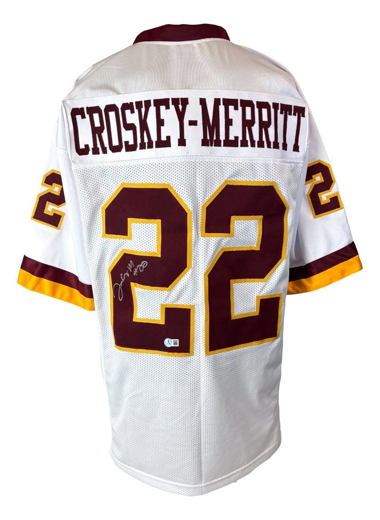 Featured is a Jacory Croskey-Merritt signed custom football jersey. This jersey has been hand signed and comes with the Beckett hologram and certificate of authenticity. This jersey features professionally sewn letters and numbers and is size XL. This jersey has no team tags or emblems and is intended as a sports collectible. This jersey would make a great addition to any sports memorabilia collection. SPECIFICATIONS Autographed By: Jacory Croskey-Merritt Team: Washington Commanders Sport: Football Authentication: Beckett