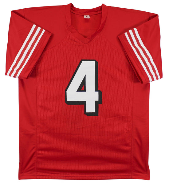 This Autographed w/ Dropshadow Red Pro Style Jersey has been Personally Signed by Jake Moody of the San Francisco 49ers. This item is 100% Authentic to include a hologram by Beckett Authentication Services. This item will come with an affixed Beckett Authentication Services (BAS) authentication sticker, which includes a scannable QR code to verify authenticity. Please note that Beckett no longer provides serial-numbered COA cards, and the attached BAS sticker will serve as the complete authentication for this item. This is a BAS Witnessed Protection Program item which means a Beckett Authentication Service representative was present when this item was being signed. We conducted an autograph signing with Jake Moody where multiples of the same item were signed. While the photographs are representative of this item, the size, placement and strength of the signature may vary. Each item is hand signed, therefore, each autograph is unique. This item can be verified through BAS Witnessed. This is a X-Large sized Jersey.