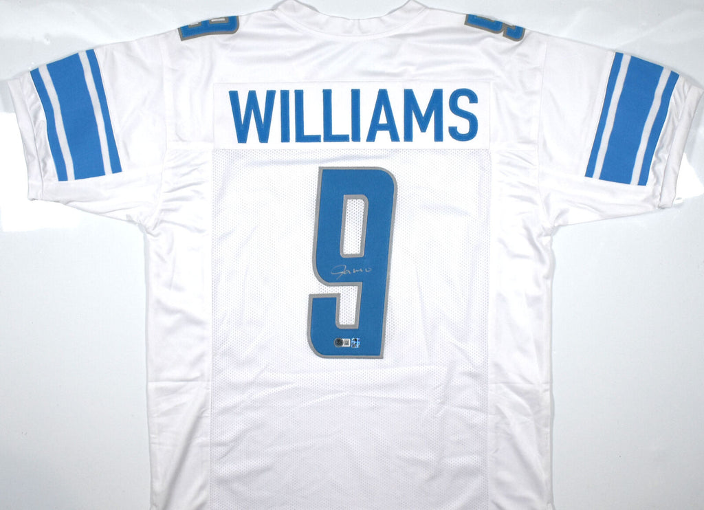 THIS IS NOT AN NFL JERSEY. THIS HAS NO TAGS, NO LOGOS, NO EMBLEMS. This is a hand autograph of Jameson Williams on a Custom Made (non name brand) Authentic Style Jersey with stitched letters and numbers. This item has a Beckett Witnessed Authentication, which comes with a numbered hologram and a QR code for verification. You can view this item on the Beckett Authentication website and it shows when and where the item was signed. It was signed either at a public autograph appearance or a private signing. This is a stock photo of the item. Although you may not receive this exact item, the item you receive is virtually identical and brand new in great shape. Jersey size is XL. THIS IS NOT AN NFL JERSEY. THIS HAS NO TAGS, NO LOGOS, NO EMBLEMS. This is a hand autograph of Jameson Williams on a Custom Made (non name brand) Authentic Style Jersey with stitched letters and numbers. This item has a Beckett Witnessed Authentication, which comes with a numbered hologram and a QR code for verification. You can view this item on the Beckett Authentication website and it shows when and where the item was signed. It was signed either at a public autograph appearance or a private signing. This is a stock photo of the item. Although you may not receive this exact item, the item you receive is virtually identical and brand new in great shape. Jersey size is XL.