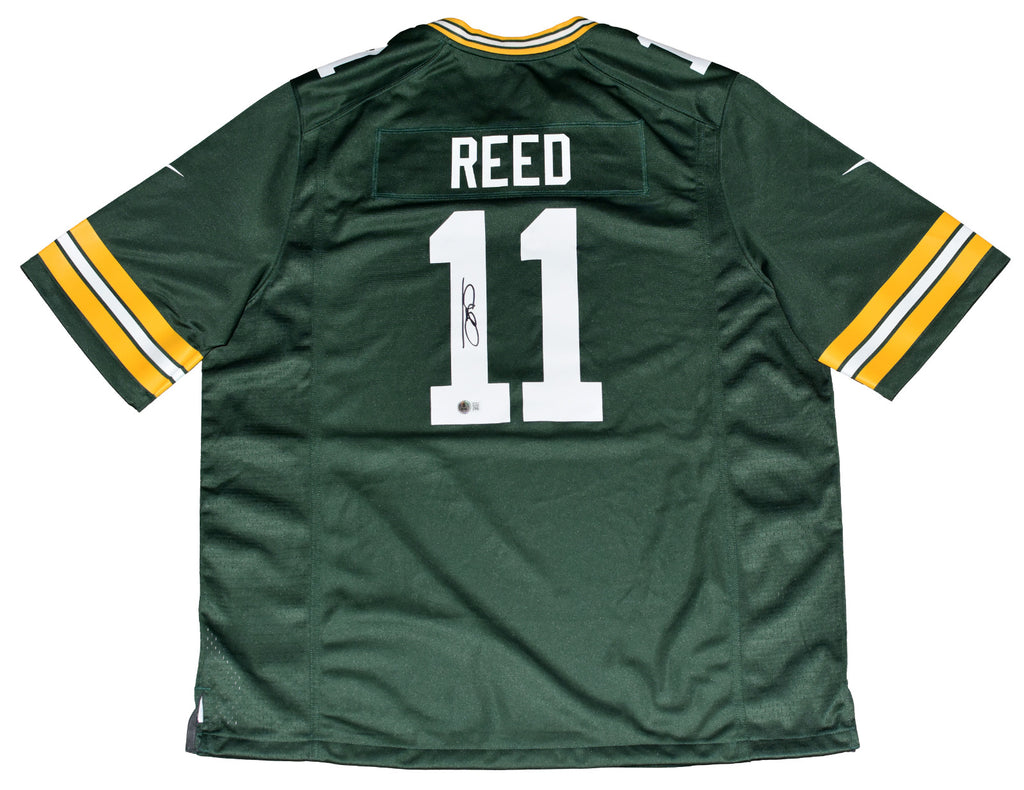 Jayden Reed, star wide receiver for the Green Bay Packers, has hand signed this green Nike jersey at a private signing. Jersey is new with tags attached and all letters/numbers are heat sealed. This item is authenticated by Beckett Authentication Services, one of the best authenticators in the industry. Their tamper-evident hologram featuring a QR code and serial number is on the item. The authenticity can be verified online by entering the serial number or scanning the QR code.Item pictured may not be the exact item you will receive. It will be similar quality, and we guarantee your satisfaction.