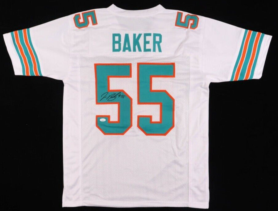 Custom on-field style jersey. Everything is sewn on, size XL. Has been hand-signed by Jerome Baker.The lot / autograph(s) includes an official James Spence Authentication (JSA) hologram and QR Code card for authenticity purposes. The signing of this item was witnessed by JSA.Authentication: JSA Hologram with QR Code cardCustom on-field style jerseys are a more affordable option for autograph seekers. These jerseys do not have any brand name or tags and are made in the Philippines. They feature stitched on names and numbers and are made to look very similar to the on-field jerseys that the players wear. These custom jerseys are very commonly used in the memorabilia industry.