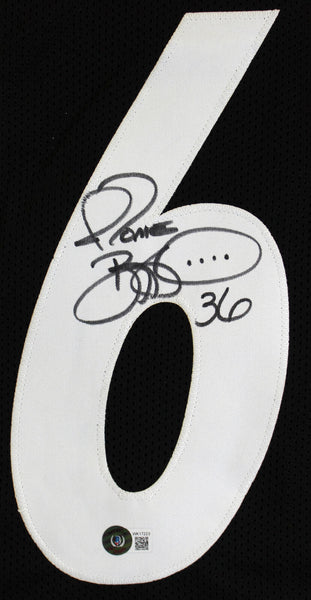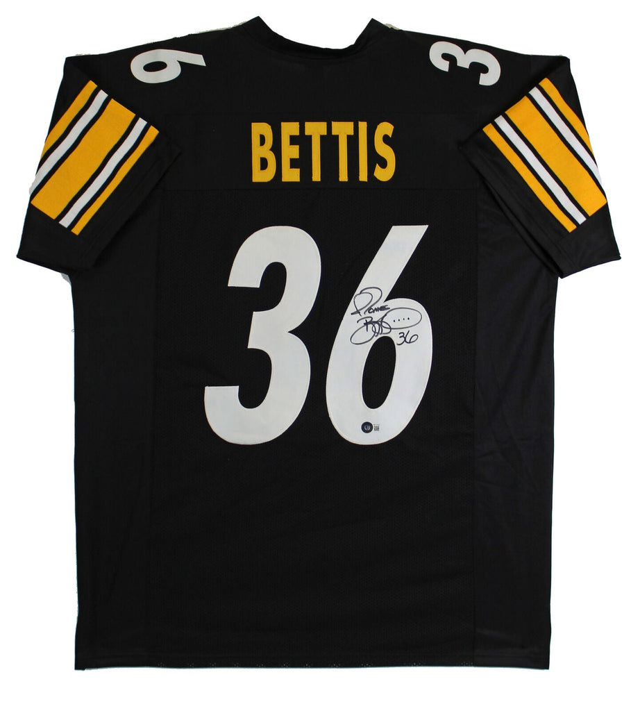 This Autographed Black Jersey has been Personally Signed by Jerome Bettis of the Pittsburgh Steelers. This item is 100% Authentic to include a hologram by Beckett Authentication Services. This item will come with the new Beckett Authentication hologram that has a scannable QR code rather than the traditional COA. If you would like to have a COA, you are welcome to reach out to Beckett for a printed certification once you receive your item. This is a BAS Witnessed Protection Program item which means a Beckett Authentication Service representative was present when this item was being signed. This is a stock item. We conducted an autograph signing with Jerome Bettis and we have several of these available. The one you will receive will be of equal quality to the one pictured. This item can be verified through BAS. This is a X-Large sized, non-branded, custom-stitched Jersey. We only offers Authentic Autographs by Jerome Bettis through Signings, In-Person Signings or Private Collections to include a 100% money back Lifetime Authenticity Guarantee.