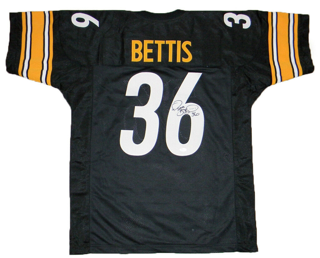 Jerome Bettis, former Hall of Fame running back for the Pittsburgh Steelers, has hand signed this black custom jersey at a private signing. Jersey is size XL and all letters/numbers are sewn-on. This item comes with a certificate of authenticity (COA) from JSA - James Spence Authentication and was signed in the presence of one of their representatives. You will receive a serial-numbered COA along with a matching serial-numbered sticker on the jersey. The authenticity can be verified online by entering the serial number.Item pictured may not be the exact item you will receive. It will be similar quality, and we guarantee your satisfaction.
