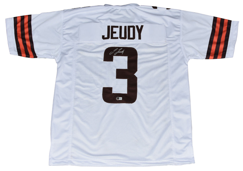 Jerry Jeudy, star wide receiver for the Cleveland Browns, has hand signed this custom jersey at a private signing. Jersey is size XL and all letters/numbers are sewn-on. This item comes with a certificate of authenticity (COA) from Beckett Authentication Services and was signed in the presence of one of their representatives. You will receive a serial-numbered COA along with a matching serial-numbered sticker on the jersey. The authenticity can be verified online by entering the serial number.Item pictured may not be the exact item you will receive. It will be similar quality, and we guarantee your satisfaction.