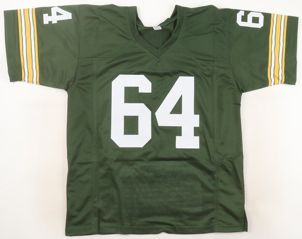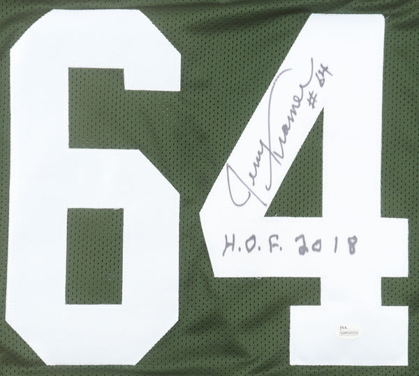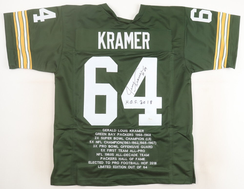 Custom on-field style jersey. Everything is sewn on, size 2XL. Hand-signed and inscribed in black felt-tip pen by Jerry Kramer (HOF). Kramer's stats have been stitched onto the reverse side of the jersey under the numbers.Kramer was an integral part of the famous "Packer Sweep", a signature play in which both guards rapidly pull out from their normal positions and lead block for the running back going around the end. Kramer was an All-Pro five times, and a member of the NFL's 50th-anniversary team in 1969.The autograph includes an official James Spence Authentication (JSA) hologram and QR Code card for authenticity purposes. The signing of this item was witnessed by JSA. Authentication: JSA Hologram with QR Code card