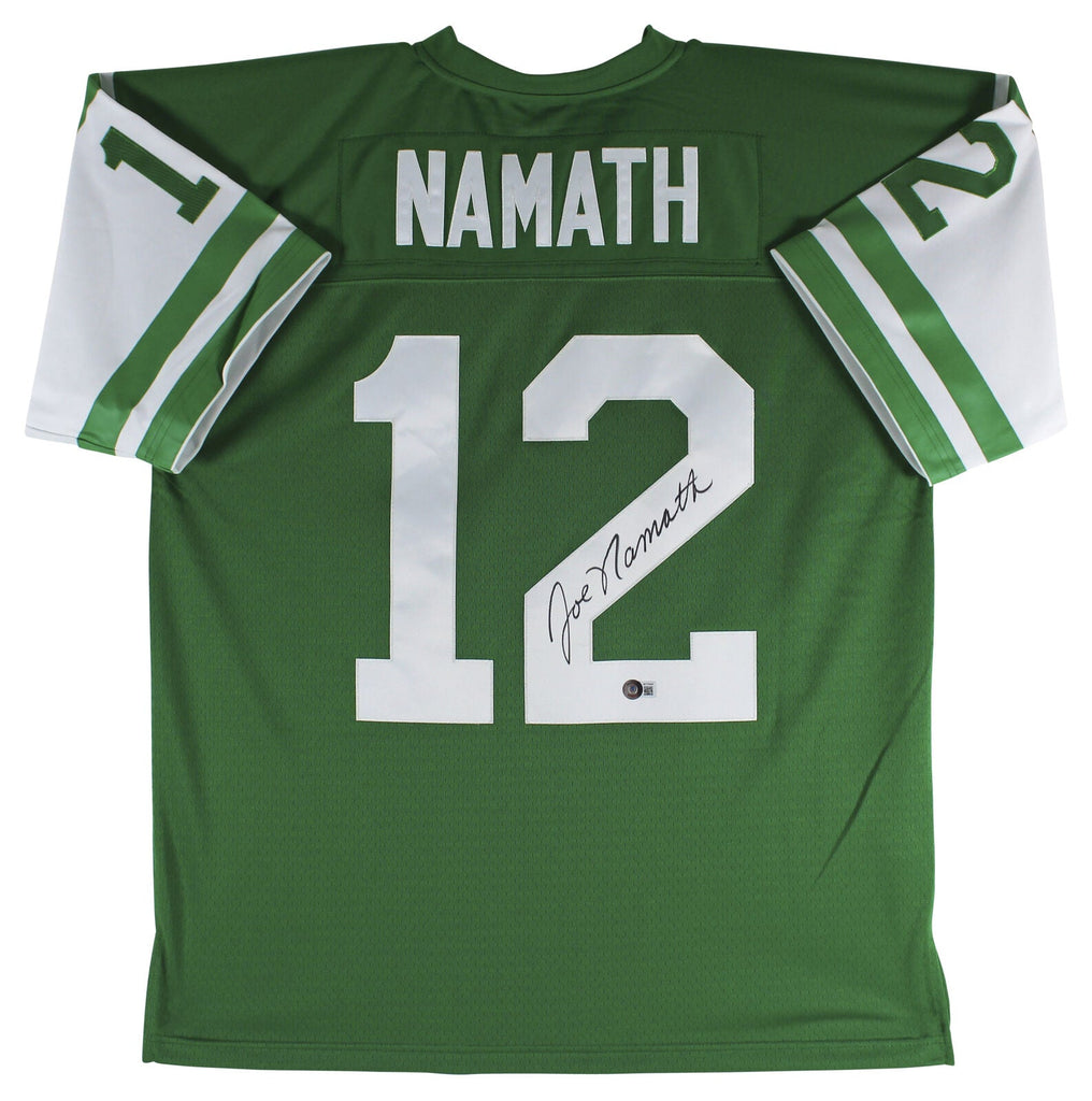 This Autographed Green Mitchell & Ness Jersey has been Personally Signed by Joe Namath of the New York Jets. This item is 100% Authentic to include a hologram by Beckett Authentication Services. This item will come with an affixed Beckett Authentication Services (BAS) authentication sticker, which includes a scannable QR code to verify authenticity. Please note that Beckett no longer provides serial-numbered COA cards, and the attached BAS sticker will serve as the complete authentication for this item. This is a BAS Witnessed Protection Program item which means a Beckett Authentication Service representative was present when this item was being signed. We conducted an autograph signing with Joe Namath where multiples of the same item were signed. While the photographs are representative of this item, the size, placement and strength of the signature may vary. Each item is hand signed, therefore, each autograph is unique. This item can be verified through BAS Witnessed. This is a X-Large sized Jersey.