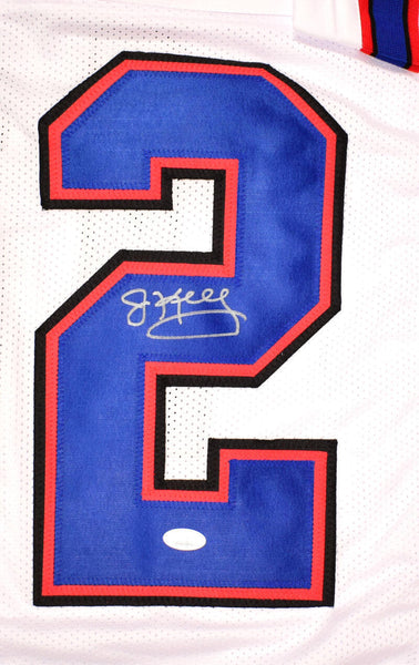 Jim Kelly Autographed White Pro Style Jersey- JSA W *Silver THIS IS NOT AN NFL JERSEY. THIS HAS NO TAGS, NO LOGOS, NO EMBLEMS. This is a Hand Autographed Jersey of Jim Kelly. This is Custom Made (Non Name Brand) Authentic Style (Stitched Letters and Numbers). This item has a James Spence Witness Authentication, which Comes with a JSA #'ed Sticker and a Matching JSA COA. You can view this item on the SpenceLOA website and it shows when and where the item was signed. It was signed either at a public autograph appearance or a Private Signing. This is a stock photo of the item. Although you may not receive this exact item, the item you receive is virtually identical and brand new in great shape. Jersey size is XL.