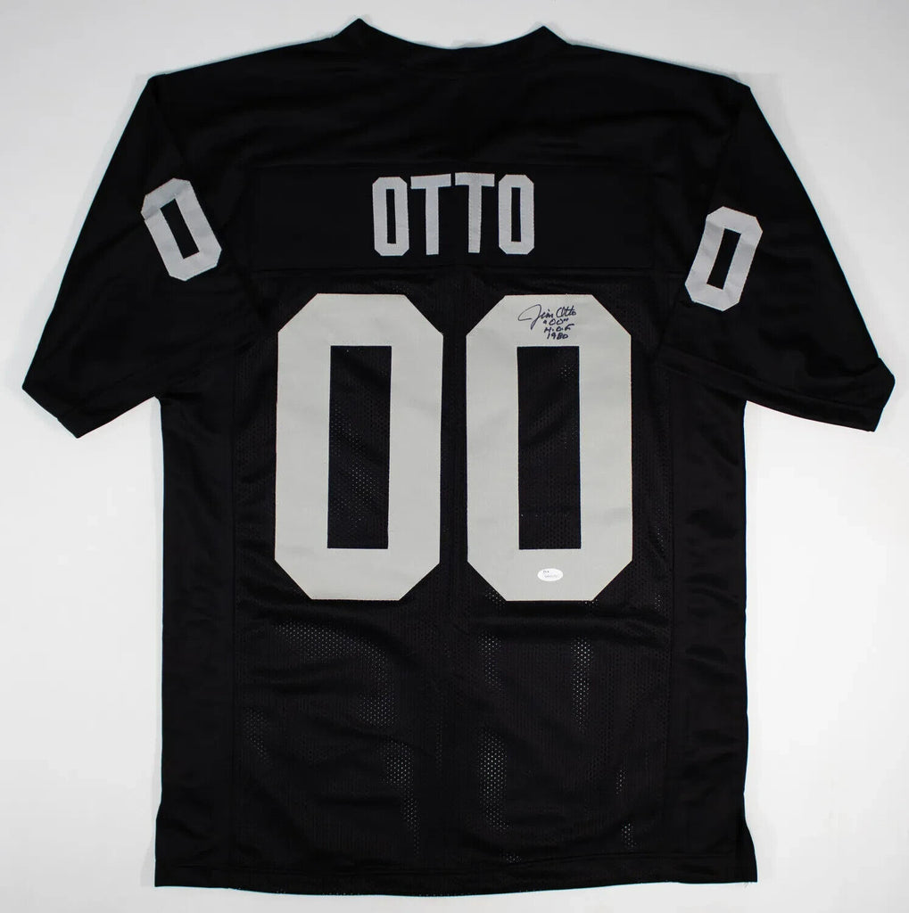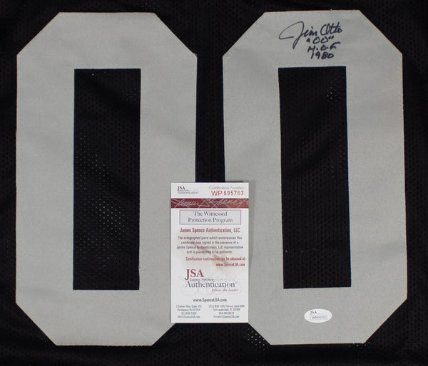 This custom on-field style adult XL autographed jersey has been personally hand-signed by Jim Otto of the Oakland Raiders. When signing, Otto inscribed "00" and "HOF 1980" along with his signature.This autograph is certified by James Spence Authentication's (JSA) Witnessed Protection Program. That means that a JSA representative was present when this item was signed. It comes with the numbered hologram and matching Certificate of Authenticity.Custom on-field style jerseys are a more affordable option for autograph seekers. These jerseys do not have any brand name or tags and are made in the Philippines. They feature stitched on names and numbers and are made to look very similar to the on-field jerseys that the players wear. These custom jerseys are very commonly used in the memorabilia industry.