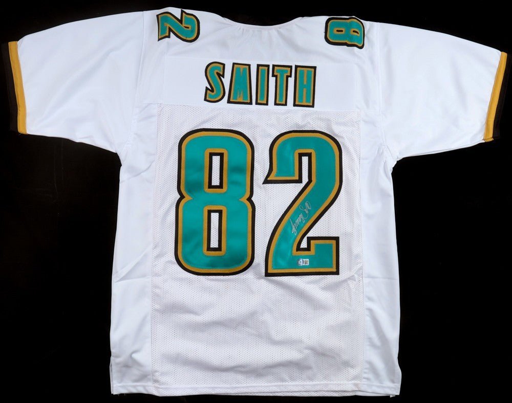 Custom on-field style jersey. Everything is sewn on, size XL. Hand-signed by Jimmy Smith.The lot / autograph(s) includes an official Beckett Authentication Services serially-numbered scannable hologram and QR Code card for authenticity purposes. The signing of this item was witnessed by Beckett.Authentication: Beckett Scannable Hologram with QR Code card