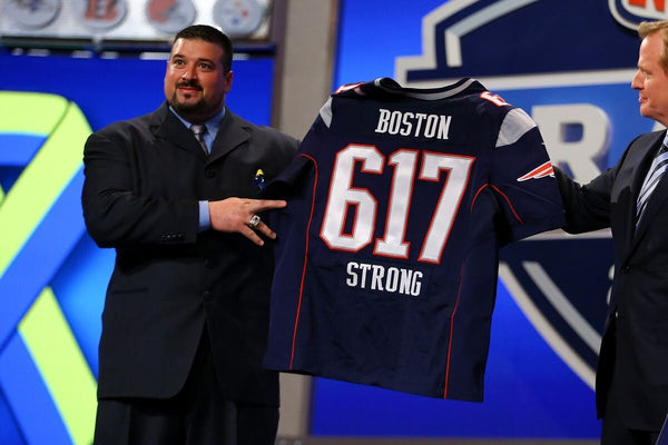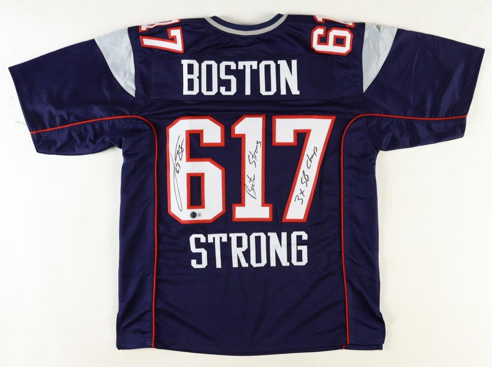 Custom on-field style Boston Strong jersey with everything sewn on, size XL. Hand-signed and inscribed by Joe Andruzzi.Former New England Patriots player Joe Andruzzi carried a woman from the scene on Exeter Street after two explosions went off on Boylston Street near the finish line of the 117th Boston Marathon on April 15, 2013.Retired New England Patriots' Joe Andruzzi and NFL Commissioner Roger Goodell honor the victims and first responders of the Boston Marathon bombings during the first round of the NFL football draft, Thursday, April 25, 2013, at Radio City Music Hall in New York.The autograph(s) includes an official Beckett Authentication Service (BAS) hologram and QR Code card for authenticity purposes.Authentication: Beckett Hologram and QR code cardCustom on-field style jerseys are a more affordable option for autograph seekers. These jerseys do not have any brand name or tags and are made in the Philippines. They feature stitched on names and numbers and are made to look very similar to the on-field jerseys that the players wear. These custom jerseys are very commonly used in the memorabilia industry.