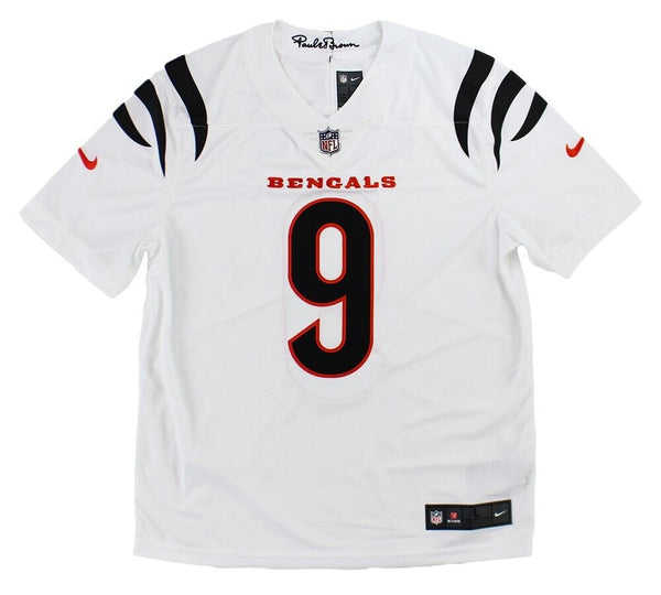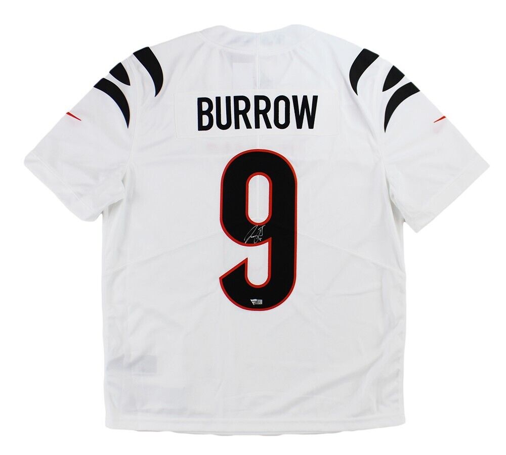 A Cincinnati Bengals Nike Limited White NFL Jersey hand signed by Joe Burrow. The item and signature are in excellent condition. Joe was Drafted into the NFL in 2020 Round 1. Joe was CFP National Champion in 2019 and received the Heisman Trophy in 2019. AUTHENTICATION: The item is accompanied by a Fanatics Authentic Serial Numbered and Databased Hologram