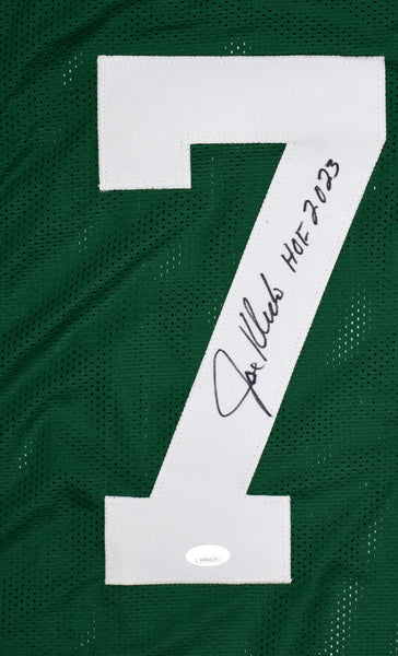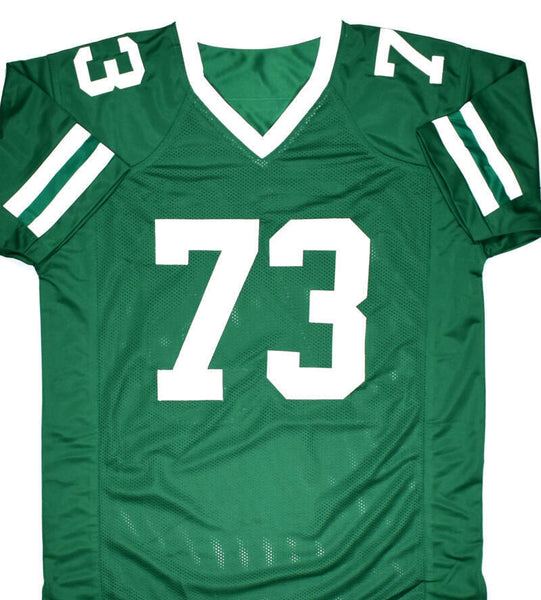 Joe Klecko Autographed Green Pro Style Jersey w/HOF- JSA Witness *Black THIS IS NOT AN NFL JERSEY. THIS HAS NO TAGS, NO LOGOS, NO EMBLEMS. This is a Hand Autograph of Joe Klecko on a custom made (Non Name Brand) authentic style (Stitched Letters and Numbers) jersey. Inscribed HOF. This item has a James Spence Witness Authentication, which comes with a JSA #'ed sticker and a matching JSA COA. You can view this item on the SpenceLOA website and it shows when and where the item was signed. It was signed either at a public autograph appearance or a private signing. This is a stock photo of the item. Although you may not receive this exact item, the item you receive is virtually identical and brand new in great shape. Jersey Size is XL.