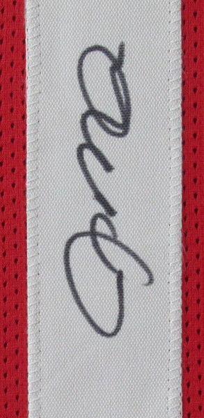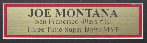 Joe montana hof autographed red custom football jersey san francisco 49ers framed. this item is professionally framed using a wooden shadow box "frame" measuring 1 3/4 by 3/4 . outside dimensions are approximately 41x33. wire attached to easily place on your wall. item will be securely shipped using ups ground. please email with any further questions. this jersey is authenticated by jsa and includes their tamper-proof hologram sticker and certificate of authenticity.