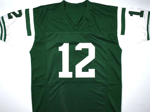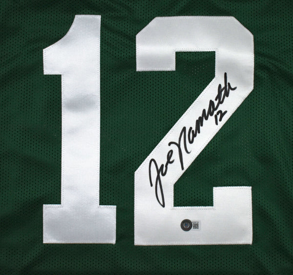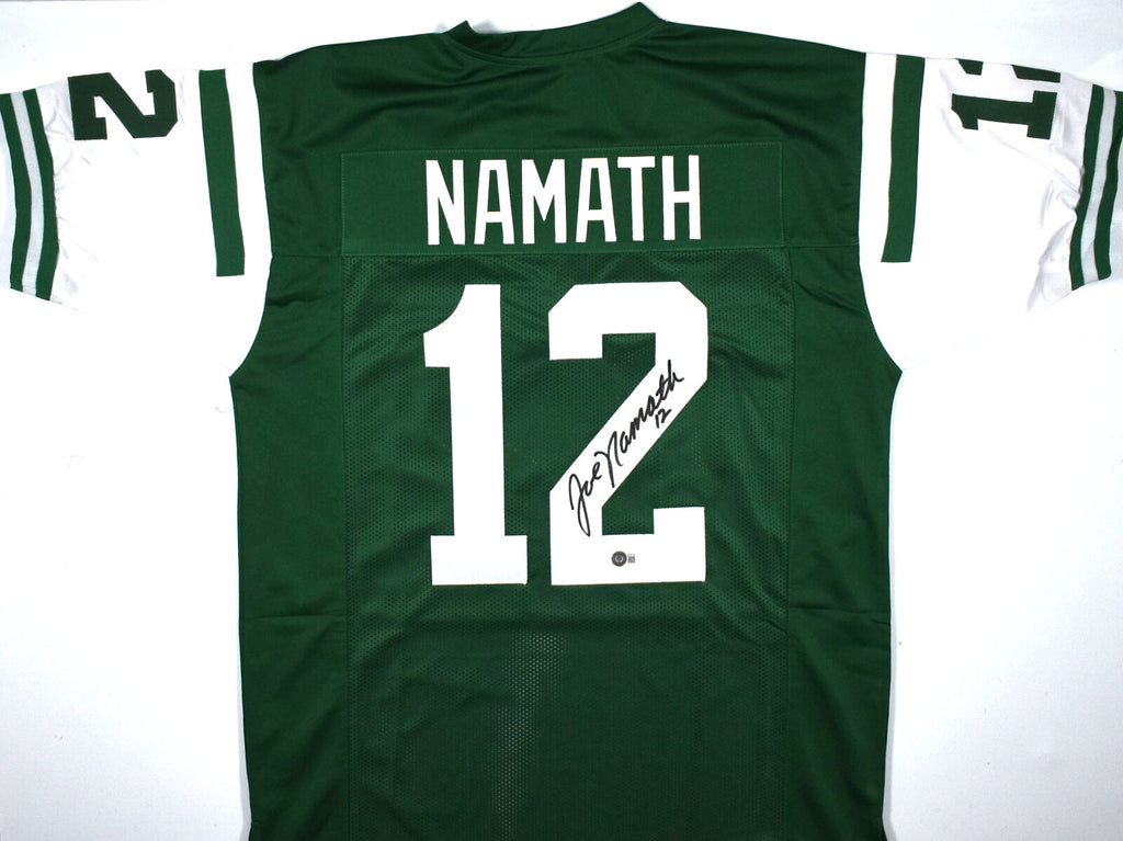 THIS IS NOT AN NFL JERSEY. THIS HAS NO TAGS, NO LOGOS, NO EMBLEMS. This is a hand autograph of Joe Namath of the New York Jets on a Custom Made (non name brand) Authentic Style Jersey with stitched letters and numbers. This item has a Beckett Authentication, which comes with a Beckett numbered sticker hologram and a QR Code for verification. You can view this item on the Beckett Authentication website. It was signed either at a public autograph appearance or a private signing. This is a stock photo of the item. Although you may not receive this exact item, the item you receive is virtually identical and brand new in great shape. Jersey size is XL. THIS IS NOT AN NFL JERSEY. THIS HAS NO TAGS, NO LOGOS, NO EMBLEMS. This is a hand autograph of Joe Namath of the New York Jets on a Custom Made (non name brand) Authentic Style Jersey with stitched letters and numbers. This item has a Beckett Authentication, which comes with a Beckett numbered sticker hologram and a QR Code for verification. You can view this item on the Beckett Authentication website. It was signed either at a public autograph appearance or a private signing. This is a stock photo of the item. Although you may not receive this exact item, the item you receive is virtually identical and brand new in great shape. Jersey size is XL.