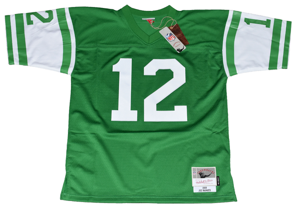 Joe Namath, former Hall of Fame quarterback for the New York Jets, has hand signed this Mitchell & Ness jersey at a private signing. Jersey is new with tags attached and all letters/numbers are sewn-on. This item is authenticated by Beckett Authentication Services and was signed in the presence of one of their representatives. Their tamper-evident hologram featuring a QR code and serial number is on the item. The authenticity can be verified online by entering the serial number or scanning the QR code.Item pictured may not be the exact item you will receive. It will be similar quality, and we guarantee your satisfaction.