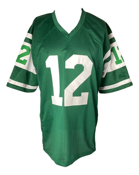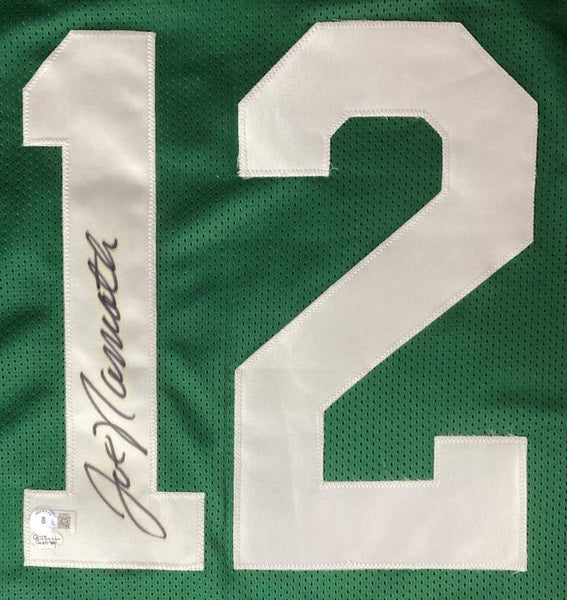 Featured is a Joe Namath signed custom football jersey. This jersey has been hand signed by Namath and comes with the Beckett hologram and certificate of authenticity, along with the Online Auctions hologram. This jersey features professionally sewn letters and numbers and is size XL. This jersey has no team tags or emblems and is intended as a sports collectible. This jersey would make a great addition to any sports memorabilia collection. SPECIFICATIONS Autographed By: Joe Namath Team: New York Jets Sport: Football Authentication: Beckett Grading Services