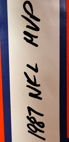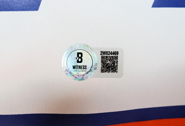 The product is a large orange Denver Broncos jersey autographed by John Elway, with an inscription. The authenticity of the signature is verified by Beckett Authentication Services (BAS). This original autographed jersey would make a valuable and unique piece for any football fan or collector of sports memorabilia, especially those who admire the Denver Broncos and the legendary quarterback John Elway.