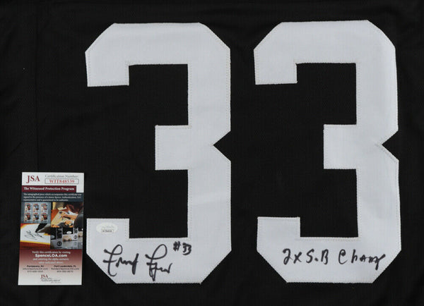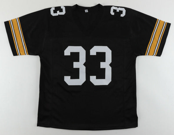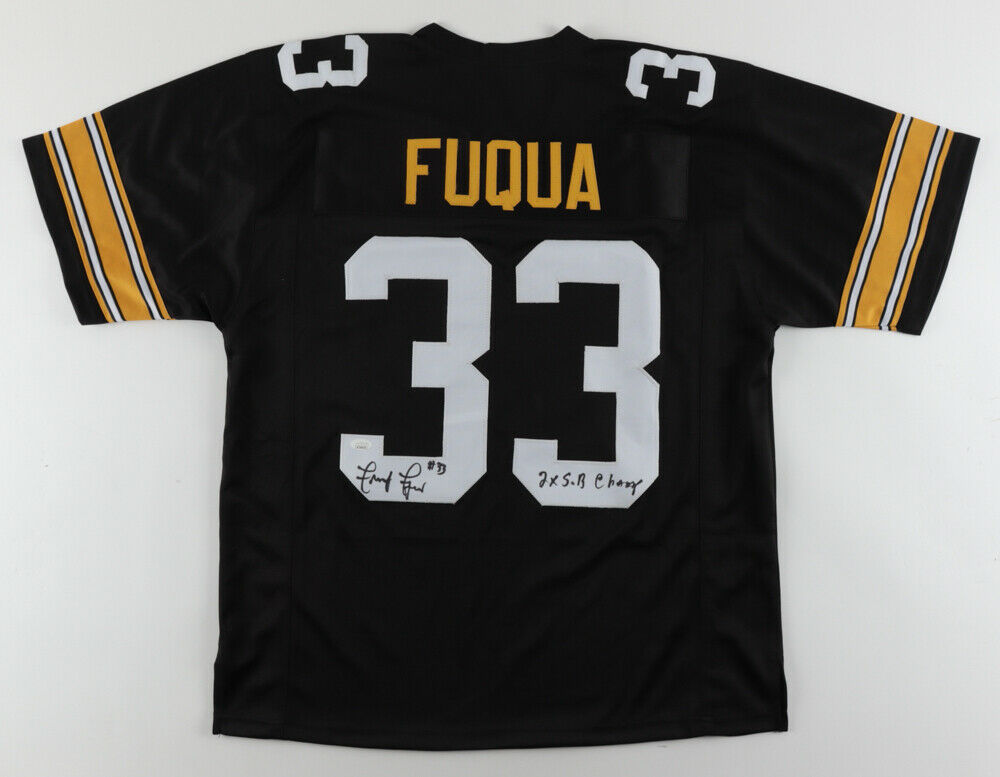 Custom on-field style jersey. Everything is sewn on, size XL. Hand-signed and inscribed in black felt tip pen by John Fuqua.Things looked bleak for the Steelers late in the 1972 AFC Divisional Playoff Game vs. the Oakland Raiders, because backup quarterback Ken Stabler had run 30 yards for a touchdown that gave his team a 7-6 lead with just 1:17 to play. Soon afterward, quarterback Terry Bradshaw and the rest of the Steelers offense were looking at a fourth-and-10 from the 40-yard line with just 22 seconds remaining. and desperately searching for the team's first ever playoff, it didn't look promising. But they never gave up. While under pressure Bradshaw through the ball in the direction of Frenchy Fuqua and as it arrived, he collided with Raider's safety Jack Tatum, and the ball ricocheted back, and Franco Harris miraculously scooped it out of the air and took off running for a 60-yard touchdown reception that gave the Steelers the 13-7 win and a wild celebration ensued. The autograph includes an official James Spence Authentication (JSA) hologram and matching COA for authenticity purposes. The signing of this item was witnessed by JSA.Authentication: JSA COA