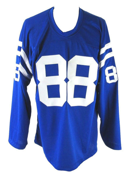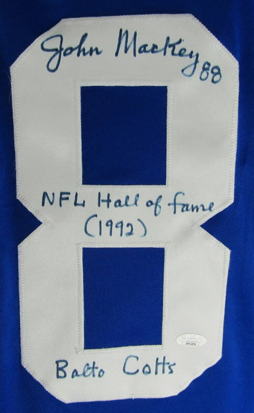 John mackey hof signed/inscribed "nfl hall of fame (1992) balto colts" baltimore colts blue custom football jersey size xl. this jersey is authenticated by jsa and includes their tamper-proof sticker and certificate of authenticity.