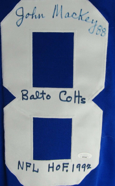 Custom on-field style jersey. Everything is sewn on, size XL. Hand-signed by John Mackey (Died 2011, HOF).The lot / autograph(s) includes an official James Spence Authentication (JSA) hologram and matching COA for authenticity purposes.Authentication: JSA COA