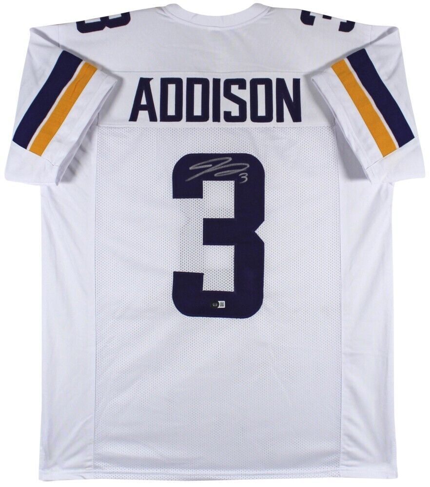 Custom on-field style jersey. Everything is sewn on, size Adult XL. Hand-signed in silver paint pen by Jordan Addison.The autograph includes an official Beckett Authentication Services serially numbered hologram and QR Code Card for authenticity purposes. The signing of this item was witnessed by Beckett.Authentication: Beckett Hologram with QR Code Card