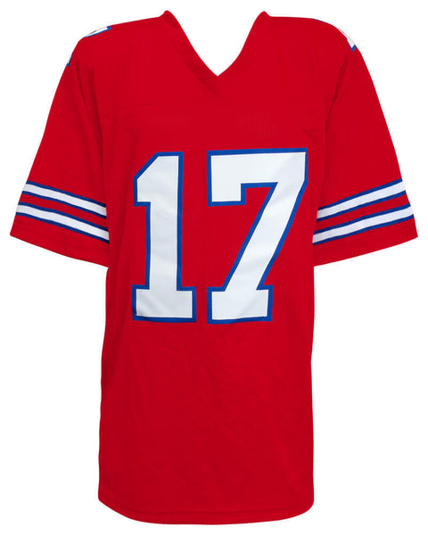 Josh Allen signed red custom football jersey. Item comes with a Beckett Authentication tamper evident numbered sticker and matching Certificate of Authenticity which can be verified online. Jersey is size XL.