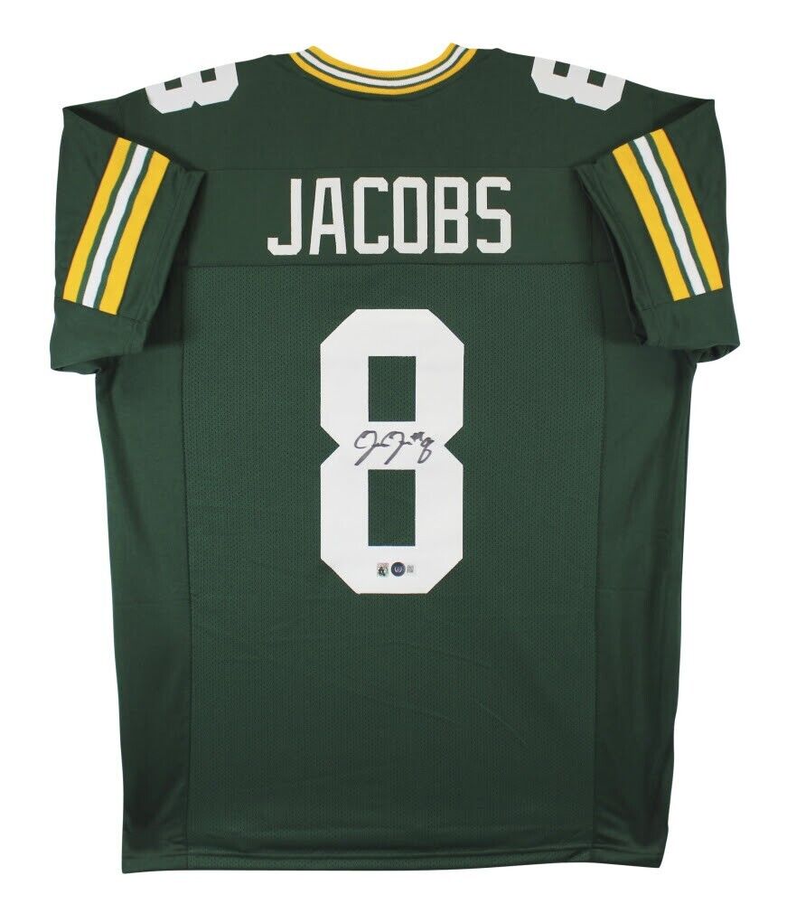 Custom on-field style jersey. Everything sewn on, size XL. Hand-signed by Josh Jacobs (Green Bay Packers).The autograph includes an official Beckett Authentication Services serially numbered hologram as well as an official Josh Jacobs player hologram and COA for authenticity purposes. The signing of this item was witnessed by Beckett.Authentication: Beckett Hologram & Jacobs COA
