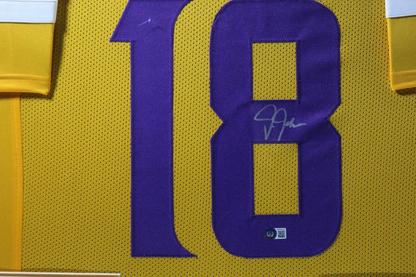 JUSTIN JEFFERSON AUTOGRAPHED & PROFESSIONALLY FRAMED PRO-STYLE JERSEY(Occasionally our own stock pictures are used at times due to quantity of framing, all frames will look identical as the one pictured)Every framed autographed jersey is accompanied with a tamper-proof hologram on the signed part of the jersey from one of the main authenticators in the industry (JSA, Beckett, PSA, etc.) and can be verified on their corresponding websites to prove authenticity.THE FRAMED JERSEY MEASURES 35"x 44" & COMES WITH THE FOLLOWING:-UV Protected Acrylic-Triple Acid Free Team Colored Matting-2 High Quality 8"x10" Photos-Team Logo
