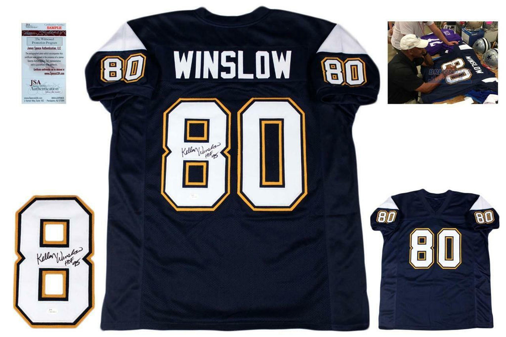 This signed item is brand new without tags or logos. This jersey is custom sewn in a size 52 (XL). All the letters and numbers are sewn on! This item will make a great gift or a great addition to any collection at an AFFORDABLE PRICE! ATHLETE: Kellen Winslow ITEM: Custom Sewn Jersey AUTHENTICATION: This item comes with a James Spence Authentication (JSA) Witnessed Certificate of Authenticity and serial #'ed hologram affixed to the item. To ensure authenticity, the hologram can be reviewed online. This process helps to ensure that the product purchased is authentic and eliminates any possibility of duplication or fraud. This item was signed in the presence JSA representative. NOTE: All of our autographed jerseys are custom jerseys, unless otherwise noted. Our custom jerseys are NON-BRANDED, have NO logos, NO tags, NO patches, NO emblems. All letters and numbers are SEWN-ON. The non-branded jerseys are made specifically for the player(s) to sign, for collectible purposes.