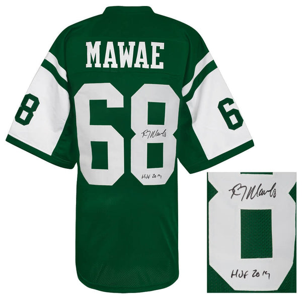 Kevin Mawae signed green throwback custom football jersey with 'HOF 2019' inscription. Item comes with a Schwartz Sports Memorabilia tamper-proof numbered hologram and Certificate of Authenticity which can be verified online. Jersey is size XL.