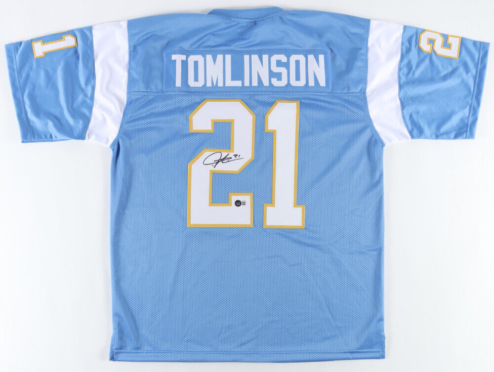 Custom on-field style jersey. Everything is sewn on, size XL. Hand-signed by LaDainian Tomlinson (HOF).The lot / autograph(s) includes an official Beckett Authentication Services serially-numbered hologram and QR Code card for authenticity purposes. The signing of this item was witnessed by Beckett.Authentication: Beckett Hologram with QR Code card