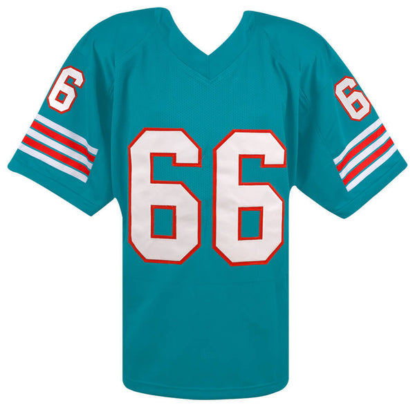 Larry Little signed teal throwback custom football jersey with 'HOF 93' inscription. Item comes with a Schwartz Sports Memorabilia tamper-proof numbered hologram and Certificate of Authenticity which can be verified online. Jersey is size XL.