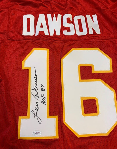 Len Dawson has autographed this jersey and written HOF 87 his Hall of Fame year. Jersey is a custom pro-style red jersey. It has no logos branding and is not associated with any league or team. Jersey is a size XL with name and numbers sewn on. Autograph is authenticated by James Spence Authentication (JSA). Comes with their certificate of authenticity and hologram on item which is verified on their site. JSA is one of the most recognized authenticators for sports autographs.