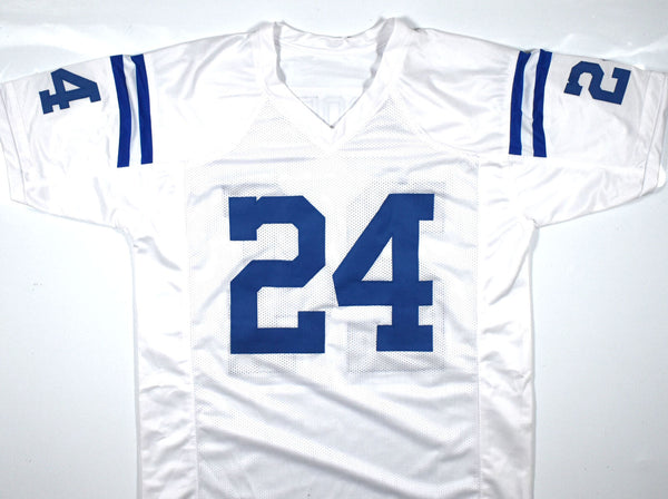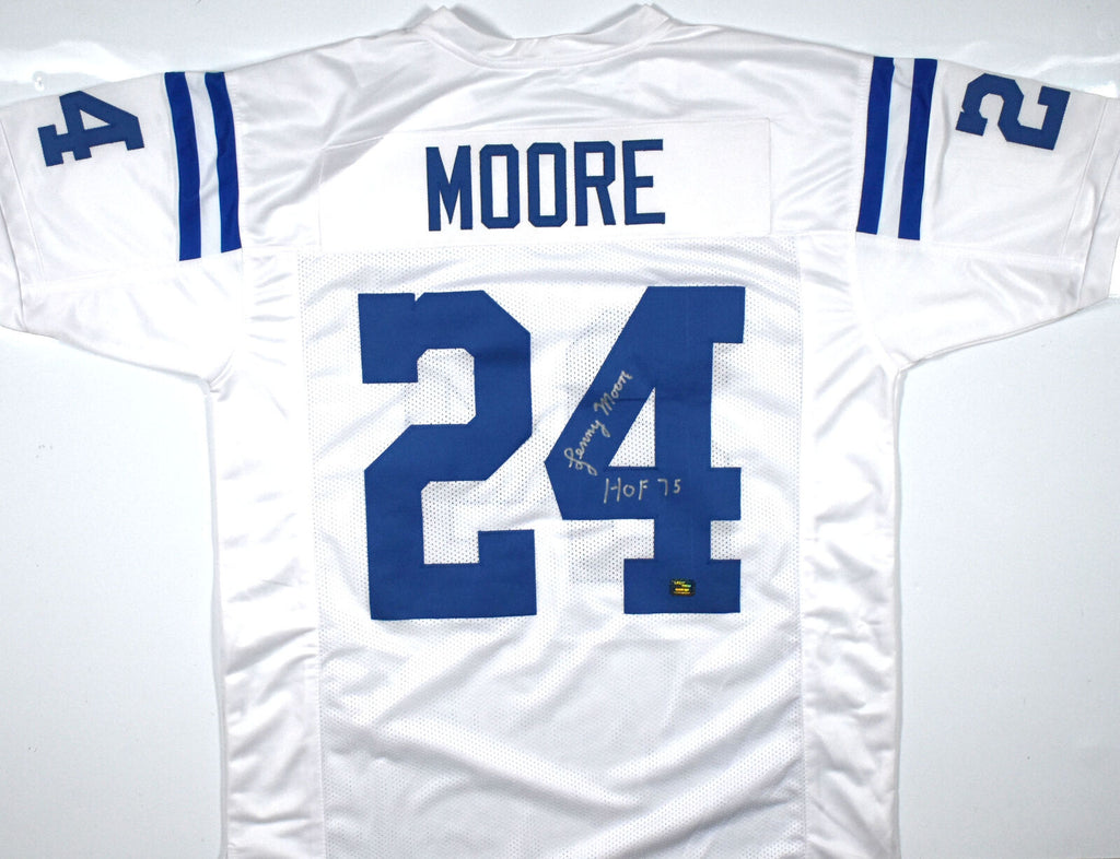 THIS IS NOT AN NFL JERSEY. THIS HAS NO TAGS, NO LOGOS, NO EMBLEMS. This is a hand autograph of Lenny Moore on a Custom Made (non name brand) Authentic Style Jersey with stitched letters and numbers. Inscribed HOF. This item has a Prova Authentication, which comes with a Prova numbered sticker hologram for verification. You can view this item on the Prova Authentication website and it shows when and where the item was signed. It was signed either at a public autograph appearance or a private signing. This is a stock photo of the item. Although you may not receive this exact item, the item you receive is virtually identical and brand new in great shape. Jersey size is XL. THIS IS NOT AN NFL JERSEY. THIS HAS NO TAGS, NO LOGOS, NO EMBLEMS. This is a hand autograph of Lenny Moore on a Custom Made (non name brand) Authentic Style Jersey with stitched letters and numbers. Inscribed HOF. This item has a Prova Authentication, which comes with a Prova numbered sticker hologram and a QR Code for verification. You can view this item on the Prova Authentication website and it shows when and where the item was signed. It was signed either at a public autograph appearance or a private signing. This is a stock photo of the item. Although you may not receive this exact item, the item you receive is virtually identical and brand new in great shape. Jersey size is XL.
