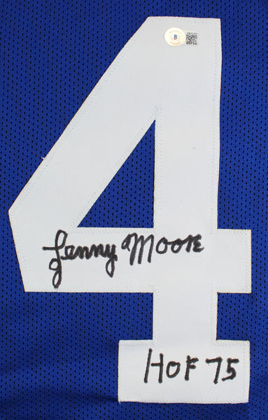 This Autographed Blue Pro Style Jersey with the inscription of "HOF 75" has been Personally Signed by Lenny Moore of the Baltimore Colts. This item is 100% Authentic to include a Certificate of Authenticity (COA) / hologram by Beckett Authentication Services. This is a BAS Witnessed Protection Program item which means a Beckett Authentication Service representative was present when this item was being signed. We conducted an autograph signing with Lenny Moore where multiples of the same item were signed. While the photographs are representative of this item, the size, placement and strength of the signature may vary. Each item is hand signed, therefore, each autograph is unique. You may receive a jersey signed on the #2 or #4. This item can be verified through BAS Witnessed. This is a X-Large sized, non-branded, custom-stitched Jersey.